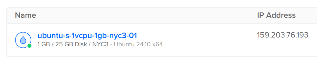The IP address is the same address as the provisioned in my VM provider of choice at Digital Ocean. This is the cheapest configuration I could find. It might be too small or under provisioned, but we can fix that later.